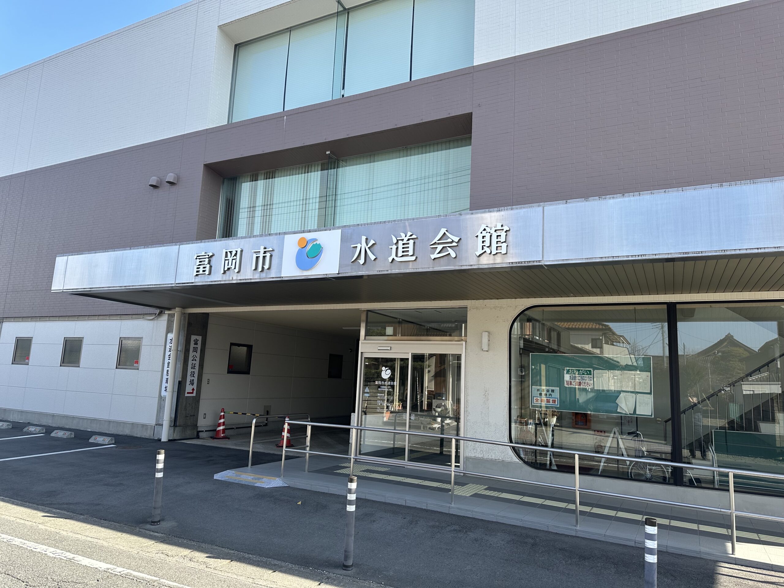 富岡市富岡1477-1に所在する水道会館は、水道料金の手続き窓口である上下水道お客様センターを擁するほか、市の水道事業全体を所管する建設水道部・上下水道経営課が置かれています。